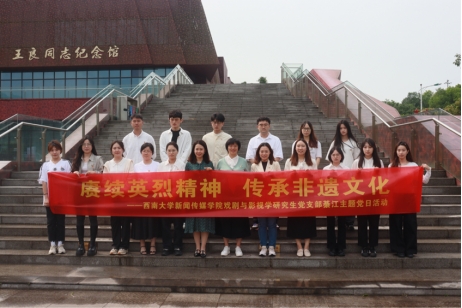 为进一步深化党员思想政治教育,引导支部同志坚定理想信念、继承革命传统,4月29日,h漫 戏剧与影视学研究生党支部赴綦江开展以“赓续英烈精神 传承非遗文化”为主题的党日活动。学院党委副书记、纪委书记邓永利,学院党委组织员胡文渊,戏剧与影视学研究生党支部书记汤天甜带队参加。