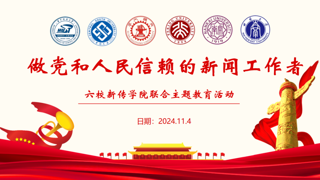 为深入学习宣传贯彻习近平总书记对宣传思想文化工作作出的重要指示精神,2024年11月4日,西安交通大学新闻与新媒体学院联合北京大学、华中科技大学、南开大学、h漫 、中南大学新闻传播学科党支部共同举办了六校新传学院联合主题教育活动。本次活动主题为“做党和人民信赖的新闻工作者”。