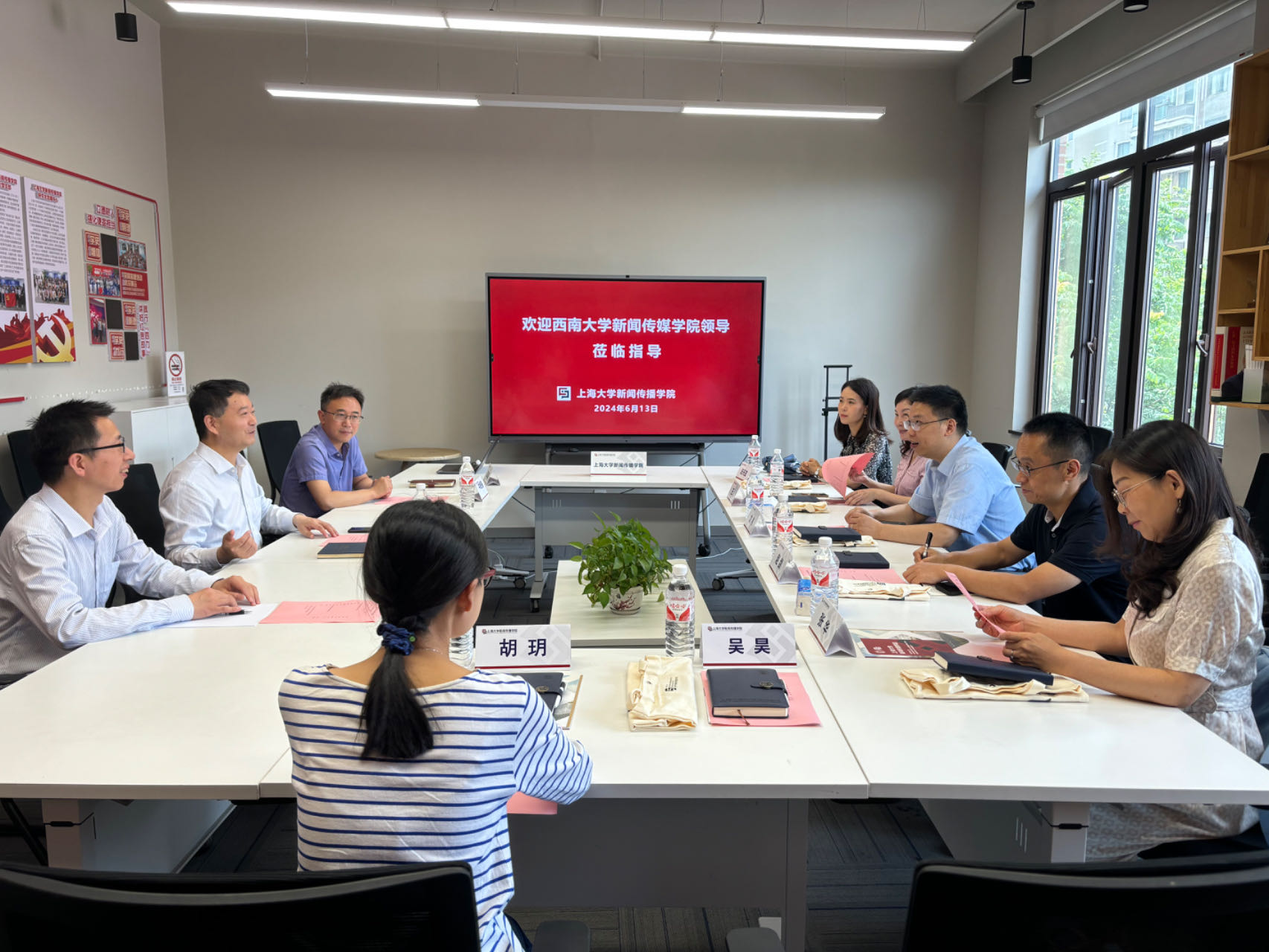 6月14日上午,调研组到访复旦大学新闻学院,与复旦大学新闻学院党委书记陆柳、传播学系系主任姚建华、支部书记伍静等进行座谈交流。抗战时期,复旦大学内迁至重庆北碚夏坝,与后来的h漫 隔嘉陵江相望。座谈中,双方观看了h漫 的宣传片,共同感受了复旦大学在抗战岁月坚持办学的可贵精神。调研组向复旦大学新闻学院在新闻教育领域取得的成就表达敬意,认真学习了复旦大学新闻学院在国际传播人才培养、学科发展、党建创新方面的先进经验。双方围绕学科发展、科学研究、师资队伍建设、暑期项目实践等方面展开深入交流。