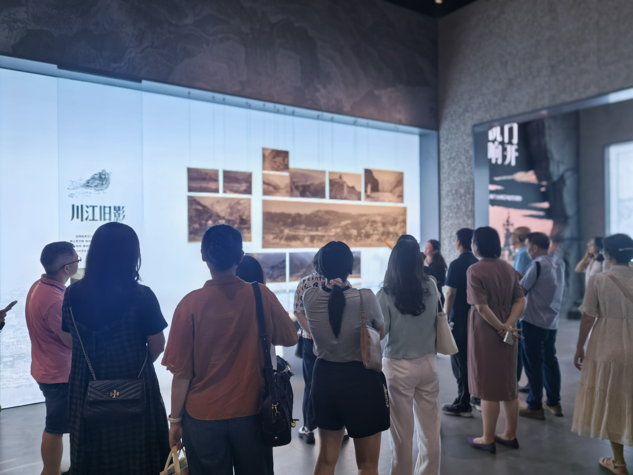 教师们参观《奋楫川江》文化展,通过详实史料、历史影像、实物展陈等系统了解川江航运的恢弘历史和文化传承。一曲激越的《川江号子》,唱响了巴渝人在峡江绝壁间不畏艰险、团结拼搏的坚韧与乐观。虚拟现实、全息影像等技术的创新运用,更生动再现了川江航运从“江岸纤夫影”到“万吨轮船通入海”的历史变迁。其间民生公司创始人、中国著名爱国实业家、中国航运业先驱卢作孚先生实业救国、全力支援民族救亡、架起抗战时期大后方生命线的抗战壮举更为川江航运文化绘就了坚强的爱国底色。